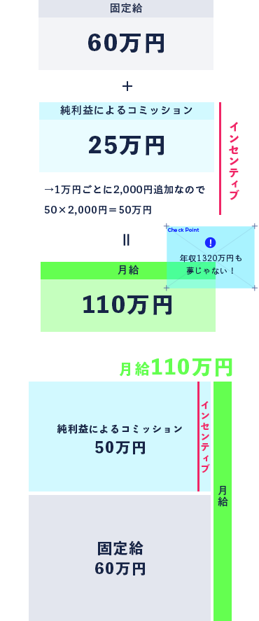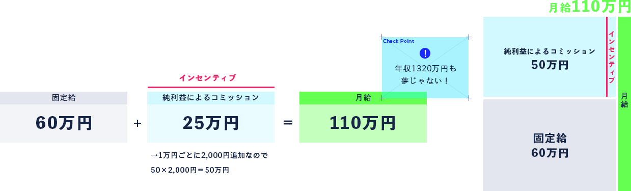 店舗の純利益額150万円以上から追加1万円ごとに固定給に上乗せされます。(上乗せされる金額は役職により変動します)